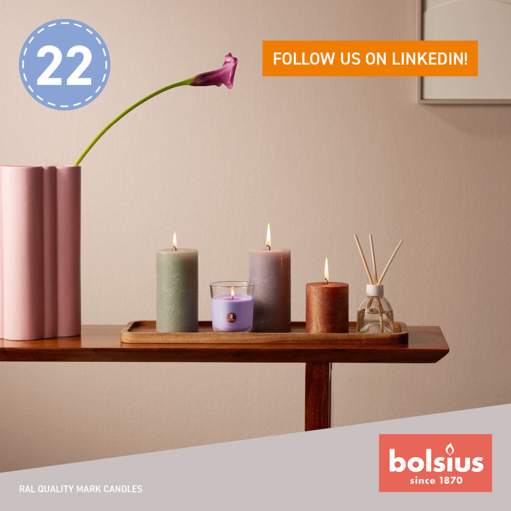Behind today’s door, a delicate oasis of well-being awaits you: the “Funky Freshness” gift box from Bolsius contains three rustic candles, a scented candle, and a reed diffuser in the soothing scent of Lavender – pure relaxation for your home. With the included candle plates, you can decorate your relaxation zone right away.