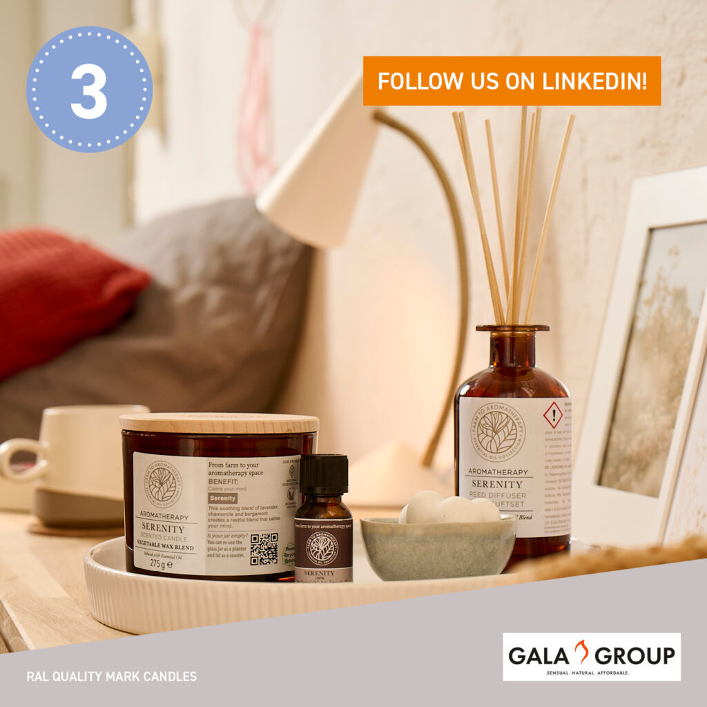 Das heutige Türchen verbirgt ein echtes Wohlfühl-Highlight: Ein ultimatives Entspannungs-Set bestehend aus Kerze, Diffuser und ätherischem Öl für eine entspannte Auszeit des Kerzenherstellers GALA GROUP GmbH. Die harmonische Mischung aus Lavendel, Kamille und Bergamotte beruhigt deine Sinne und hilft dir, deine innere Mitte wiederzufinden. Verwandle deine Umgebung in einen persönlichen Aromatherapie-Spa und erlebe pure Entspannung! Mit Duft (Duftreihe Serenity – Lavendel, Kamille, Bergamotte)