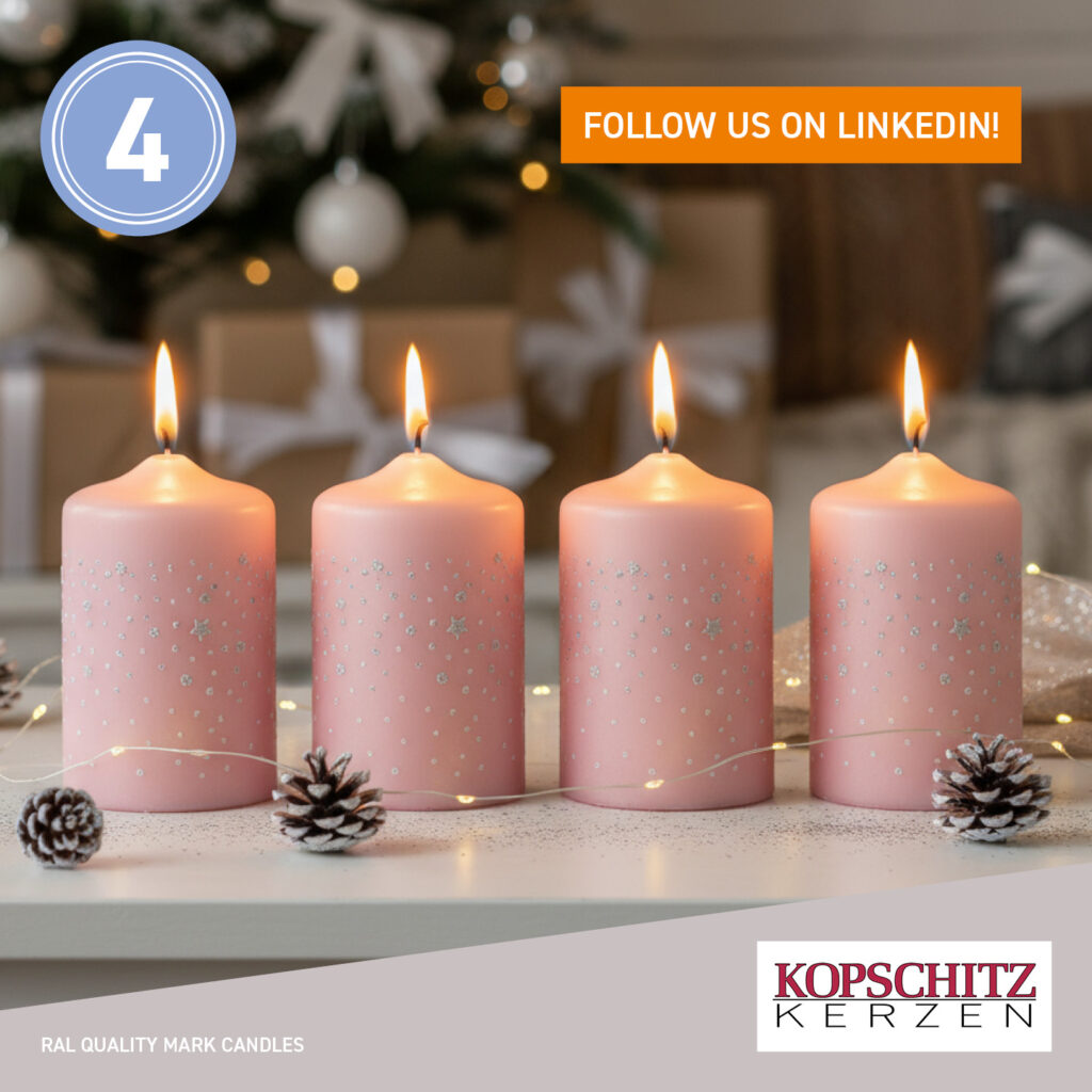 Entdecken Sie die bezaubernde Kerzenvielfalt der Erich Kopfschitz GmbH. Hinter dem ersten Türchen befindet sich ein edles 4er-Set Stumpenkerzen „Sternenregen“!